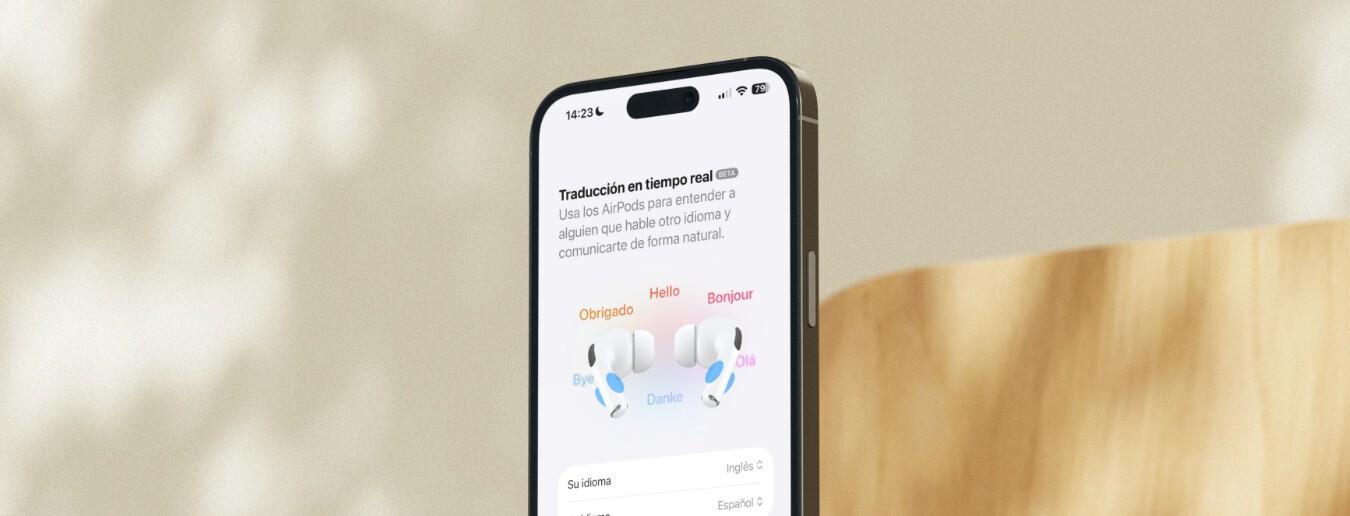 - Permite conversaciones bilingües en tiempo real, con audio en los AirPods y salida por el altavoz del iPhone.